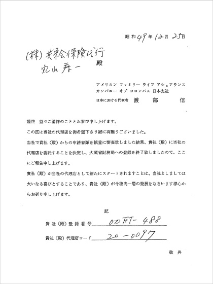 アメリカンファミリー生命(現アフラック)と代理店契約を締結
